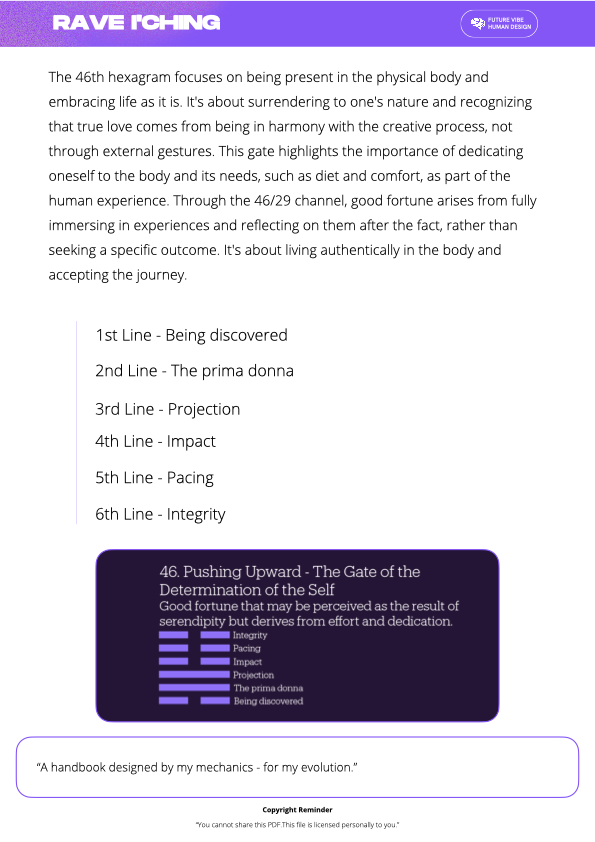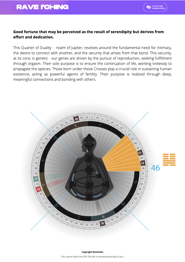 Instant PDF download for 46. Pushing Upward – The Gate of the Determination of the Self. Unlock the full Human Design insights for this gate.